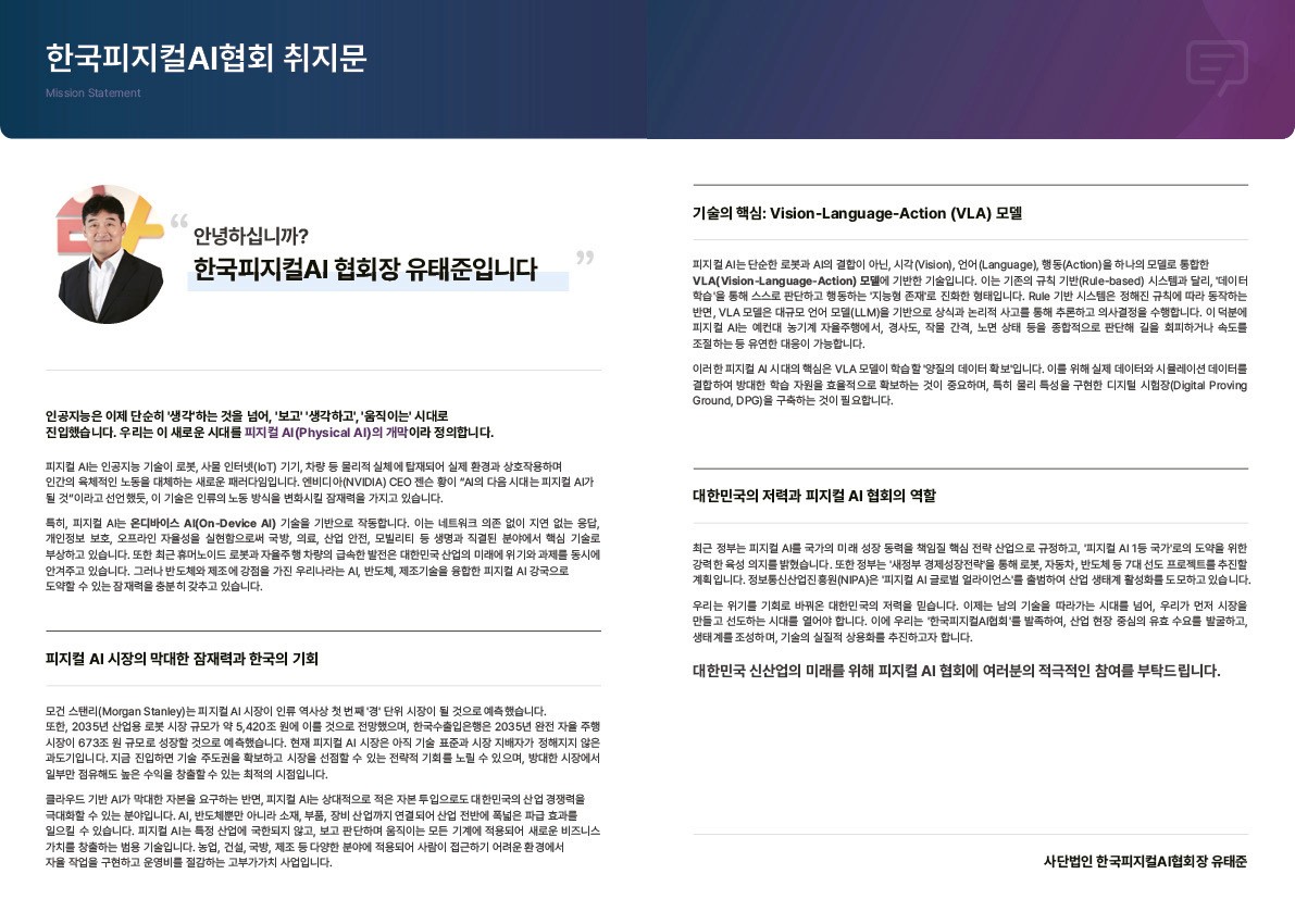 모건 스탠리가 예측한 '경' 단위의 막대한 시장 잠재력 앞에서, 지금은 기술 주도권을 확보하고 시장을 선점할 최적의 시점입니다. 정부 또한 피지컬 AI를 핵심 전략 산업으로 규정하고 강력한 육성 의지를 밝혔습니다. 이에 우리는 '한국피지컬AI협회'를 발족하여 산업 현장의 유효 수요를 발굴하고, 생태계를 조성하며, 기술의 실질적 상용화를 이끌어 나가고자 합니다. 대한민국 신산업의 미래를 위해 여러분의 적극적인 참여를 부탁드립니다.